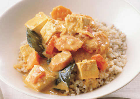 Eating soy can help conserve water. Livestock require water for growing what they eat, for drinking, and for cleaning up after them. If you replace one pound of beef with tofu each month, you’ll save 20,000 gallons a year. Get the recipe for Panang Tofu Curry pictured above.