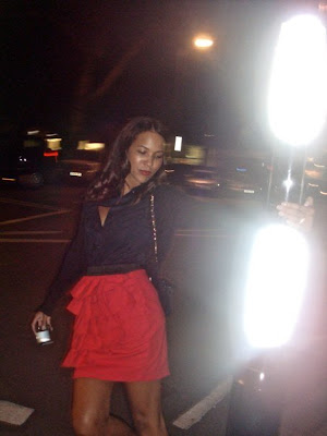 Me in my Red Phillip Lim Ruffle Skirt and Black Marc Jacobs Ruffle Shirt and Black Cashmere Cardigan.