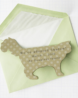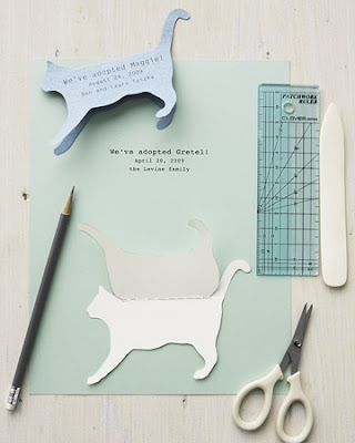 Download and print pet announcement template; cut out. Print your new pet’s name and other information on cardstock. (You may be able to make two cards from one sheet of cardstock, depending on the template you’ll use.) Hold the cardstock, type-side facing you, against a window and place the template over it; the light shining through the paper should help you position the template properly, so the message is straight and centered. Trace the template onto the cardstock; cut out. Erase pencil marks, as needed. Place a ruler across the animal’s back (where the card’s fold will be), and run a bone folder alongside it to score the cardstock; fold to create card. - Martha Stewart