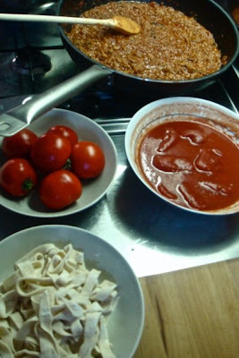 All of the freshest ingediants from the Local farmers market needed to make homemade Spaghetti Bolognese and pasta from scratch! Yummy!