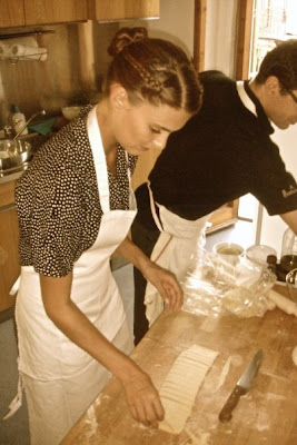 Veronica Cuts Pasta Dough with our Chef and Instructor.